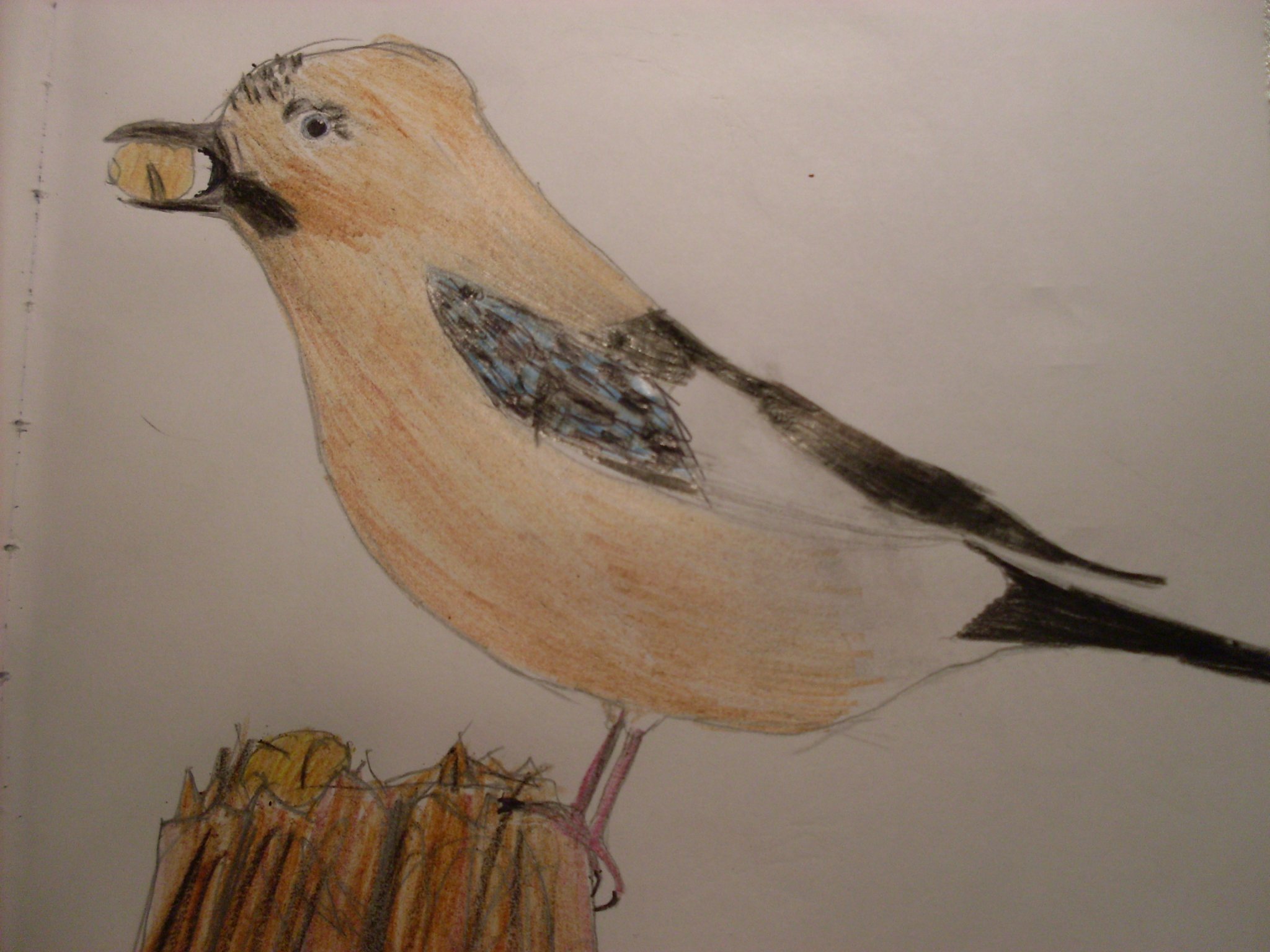 A szajkó lábait, arcfoltját és a fatönköt se felejtsük el megrajzolni.