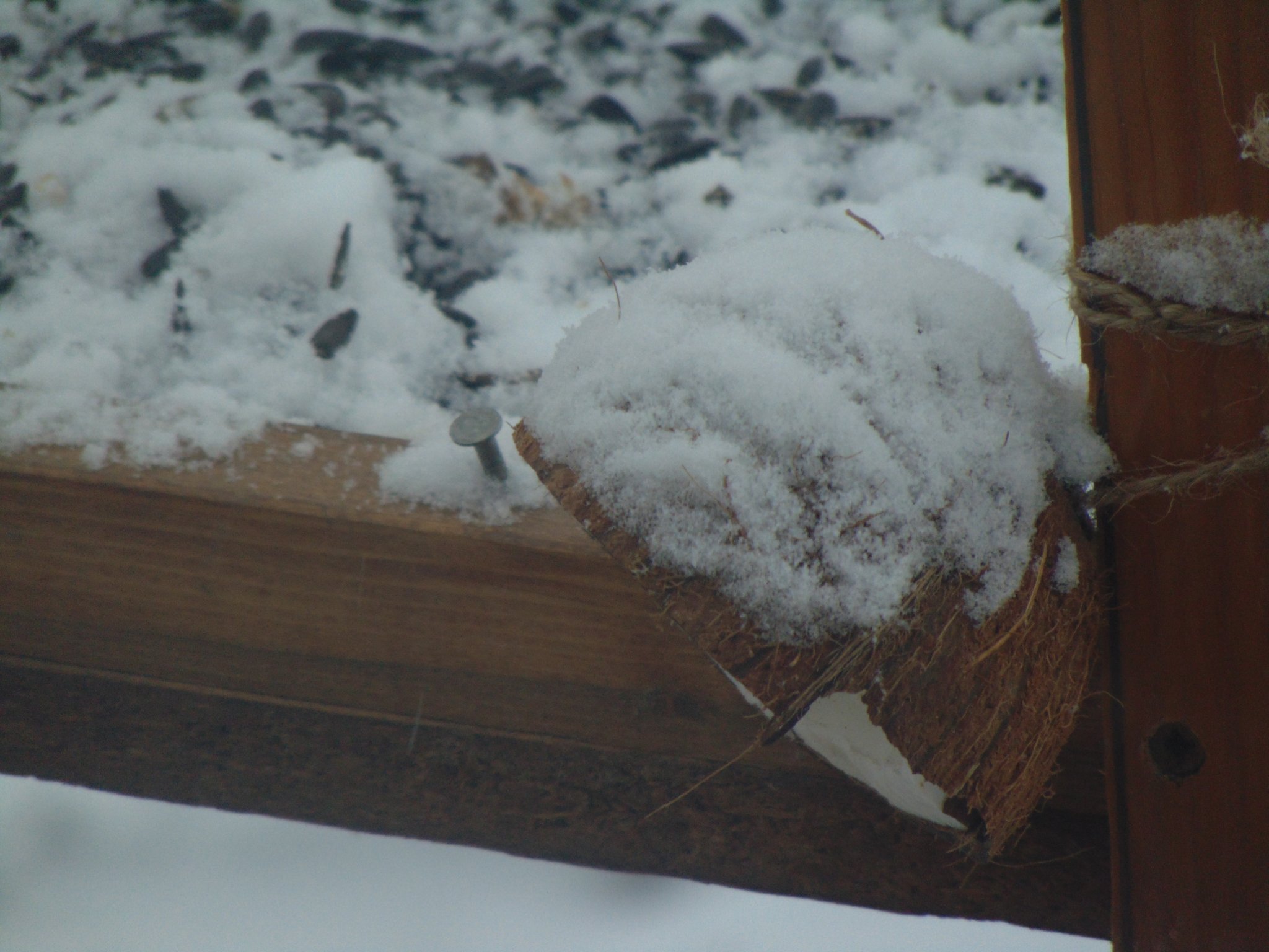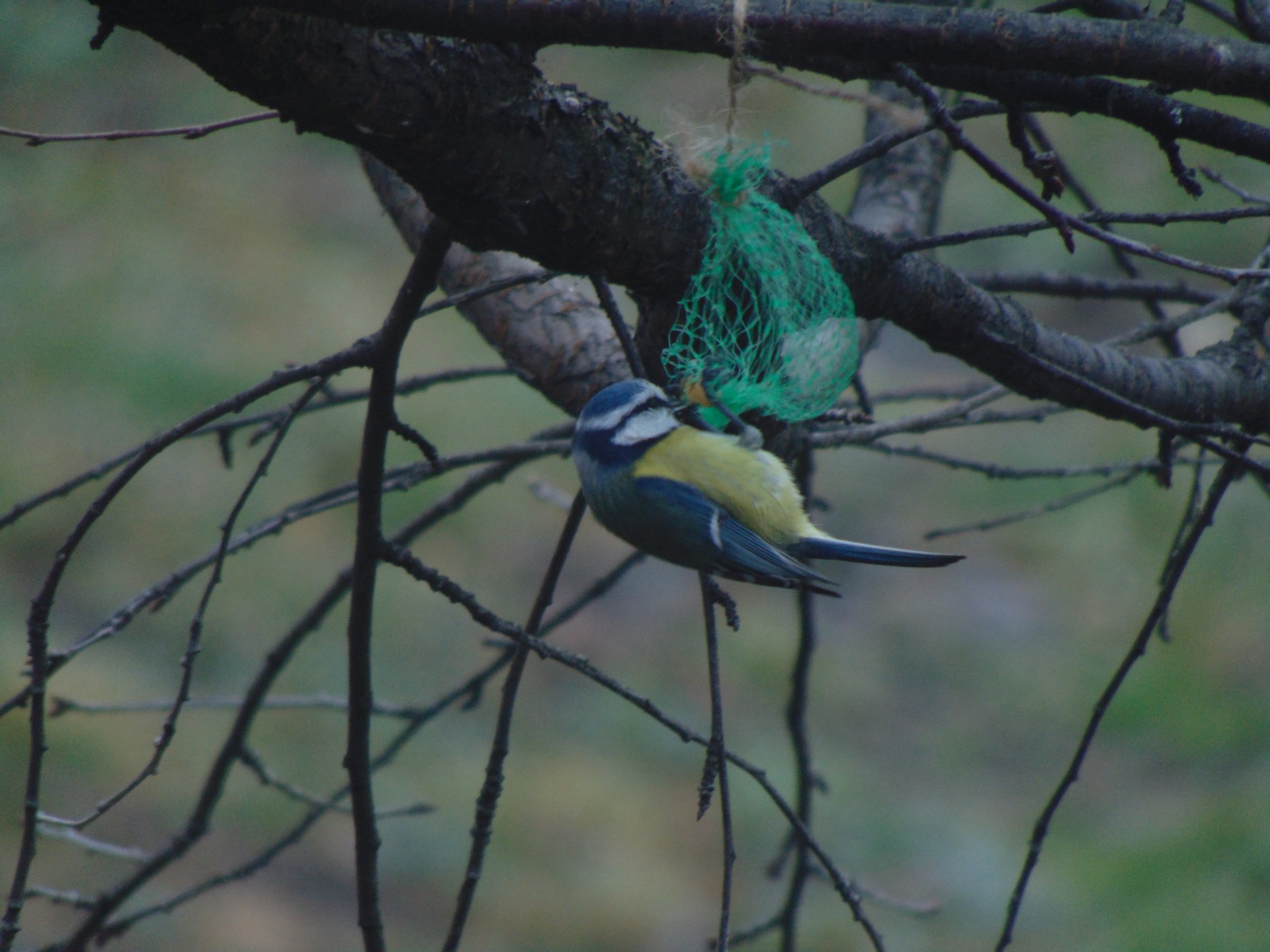 cinkegolyó hálóban és felszegezve, napraforgómaggal, a madárasztalon széncinege