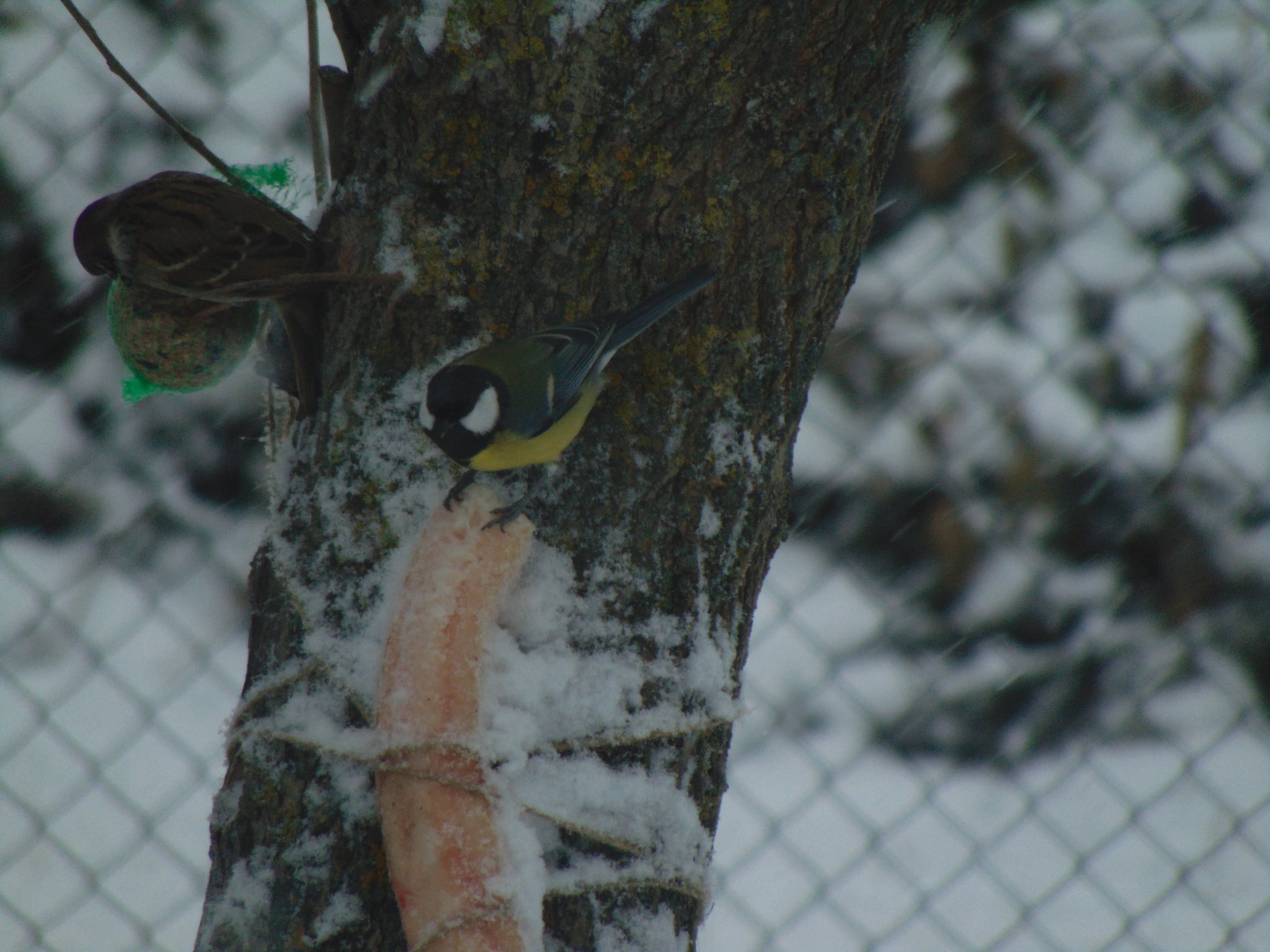 széncinege fatörzsre kötözött zsiradékon